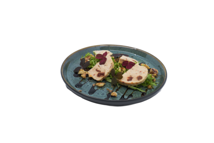 Kyllingeterrine med balsamicosirup på bund af frisee salat med ristede valnødder