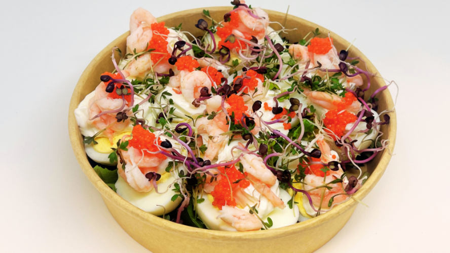 | Halve æg med hjemmelavet mayonnaise, håndpillede rejer fra Skagen, stenbiderrogn, karse og radisespirer | |