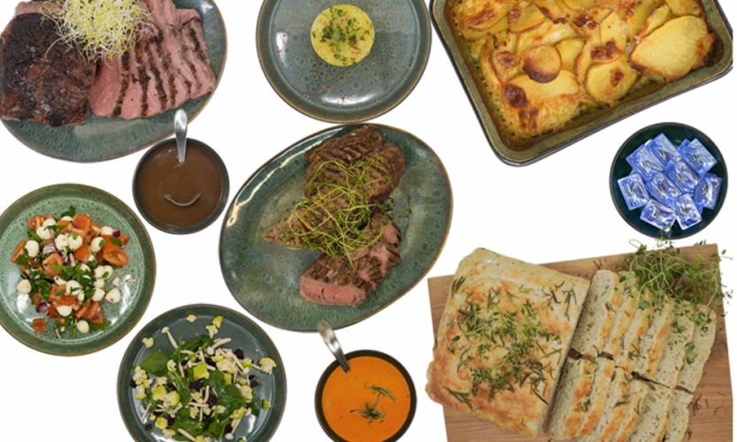 Oksemørbrad, kalvefilet, kartofler, salater, brød og 2 slags sauce.